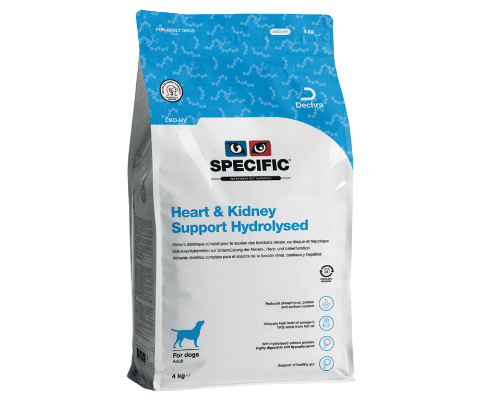 SPECIFIC® Heart & Kidney Support Hydrolysed – tai visavertis sausas pašaras, skirtas širdies, kepenų ir inkstų funkcijai palaikyti suaugusiems šunims, sergantiems lėtiniu inkstų nepakankamumu.