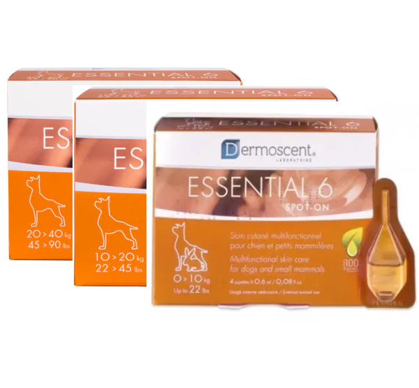 Dermo-kosmetikos serijoje Essential 6 spot-on yra pirmasis daugiafunkcinis produktas šunų odos priežiūrai. Essential 6 spot-on tinka visų tipų odai ir kailiui, netgi labai lūžinėjantiems plaukams ir jautriai odai. Jį rekomenduojama naudoti vieną kartą per savaitę. Essential 6 spot-on yra hipoalerginis, be kvapiųjų medžiagų. Jo sudėtyje yra vien tik natūralios, aktyvios medžiagos. Šio produkto sudėtis patentuota.
